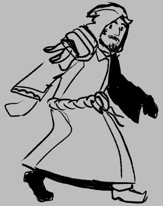First inspection of Worth Taggin would show a roughly average tidesage, robed and cowled, standing on the sidelines or performing his duties. Scrolled shoulders give glimpses of inscriptions, prayers, and tidal maps indicating a wavespeaker. Upon his rope belt, an Abyssal Beacon is tied with a cord, the lantern usually unlit until in use. Near it a Dead Ringer dangles on its own cord, giving faintly muffled clinks. On the other side a sheathed sword seems almost incongruous to the tidesage's mild demeanor, as the hilt indicates that it's the blade of a naval officer rather than an instrument of elemental force.Underneath the hood is a meek and worried face, somewhere in his thirties with a curved nose and expressive brown eyes. Dark, curling hair holds premature greying streaks at the temples, and a finely-groomed mustache rests above what can be a goatee or very fine beard depending on his mood. Worth's face is as open as the sky, lighting up or changing instantly as he reacts with his typical blend of concern and enthusiasm.Being a late bloomer or shy scholar would not stop Worth from finding adventure and wonder on the horizon. He's been dumped into adventures from horrific to noteworthy, exploring corruption and morality along with themes of inheritance and power. Nor has he been alone on these quests.Ultimately, Worth only wants to be a normal man, secure in his work and in control of himself. He wishes to show proper respect to the seas that grant him the ability to move them, and to live up to the expectations of those he cares about.